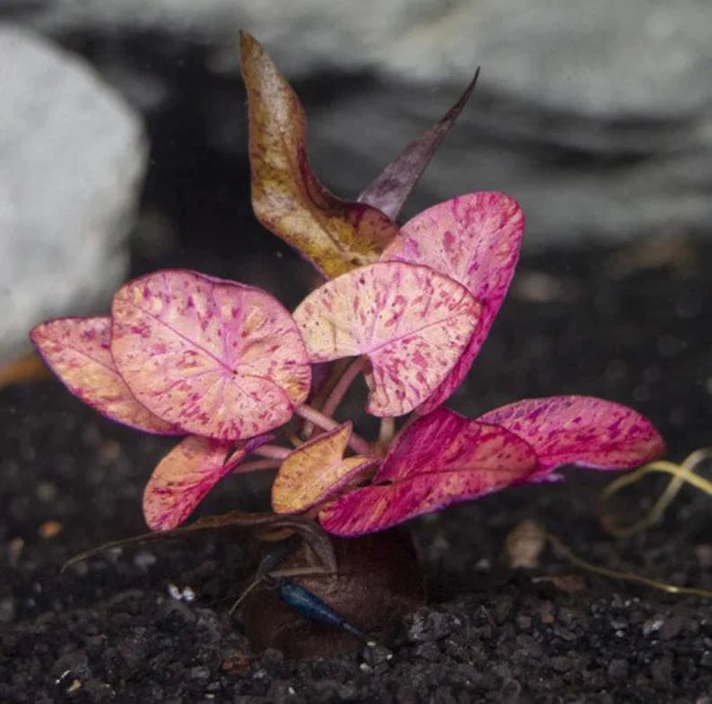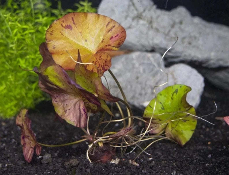 The plant begins as a compact cluster of arrow-shaped leaves, approximately 4 inches long, and gradually develops stems that reach the water surface, where the floating lily pads create a serene, natural appearance. Its leaves range in color from reddish-bronze to pinkish-green, making it one of the most eye-catching centerpiece plants for any aquascape.